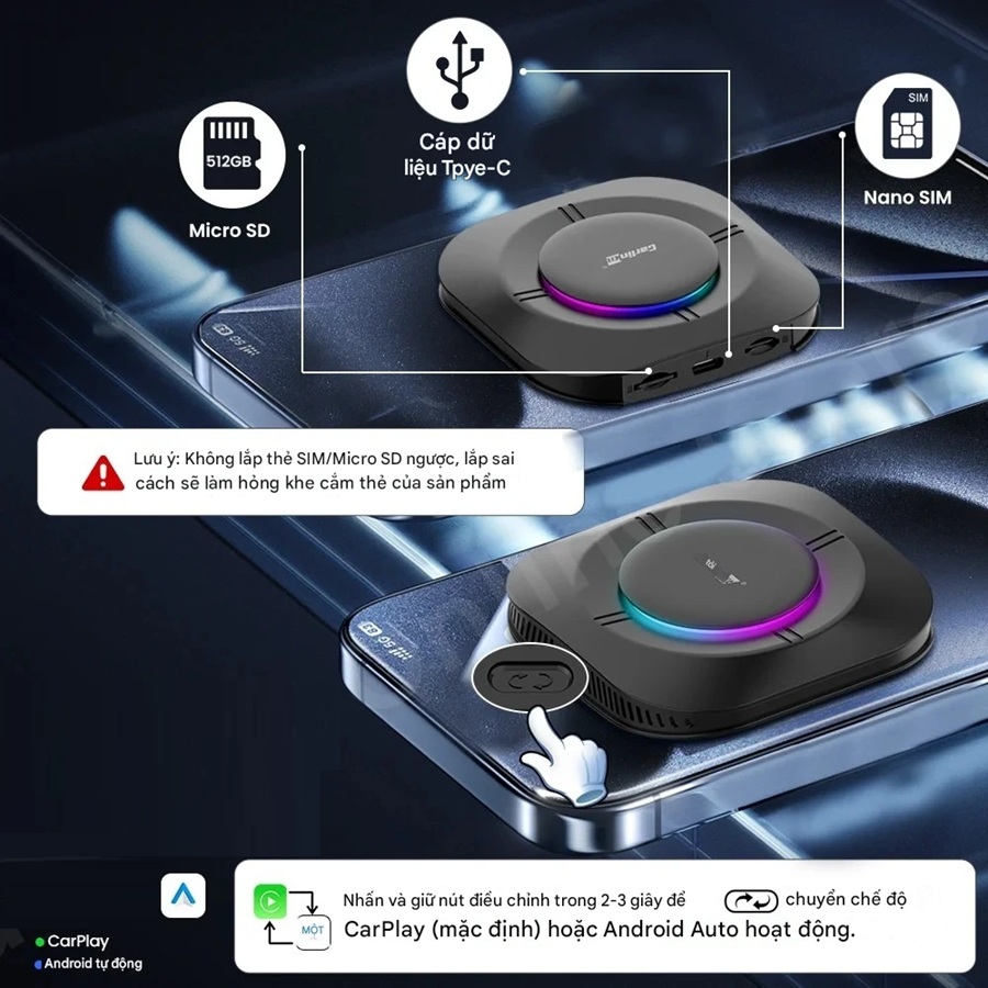 Thiết bị hỗ trợ biến CarPlay có dây/Android Auto có dây thành CarPlay không dây (cho iPhone 6 trở lên/iOS 10.0 trở lên) và Android Auto không dây (cho Android 11.0 trở lên)