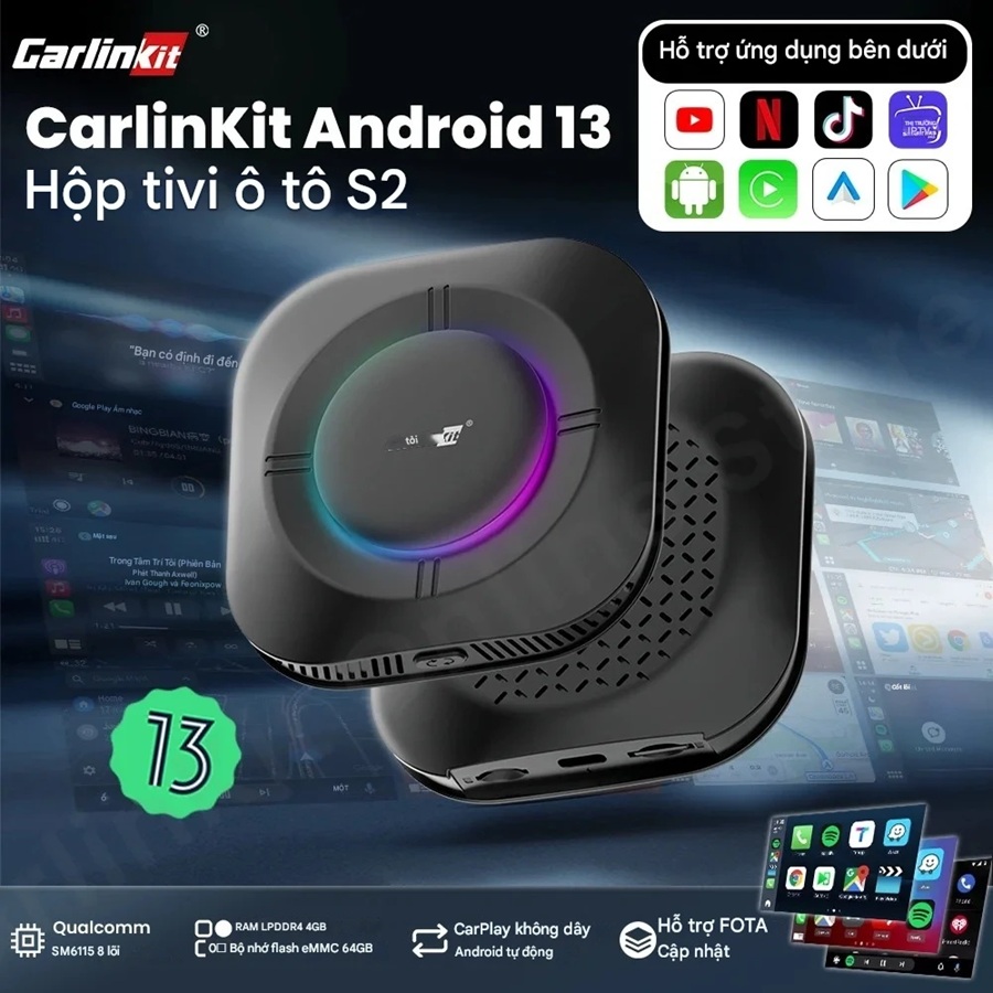 Bạn muốn nâng cấp màn hình zin xe hơi thành Android mạnh mẽ mà không cần thay đầu DVD? Carlinkit S2P Android Box Ô Tô chính là “vũ khí bí mật” với CPU Qualcomm QCM6115 8 nhân, 8GB RAM + 128GB ROM, chạy Android 13 mượt mà, và kết nối SIM 4G + Wi-Fi 5G.