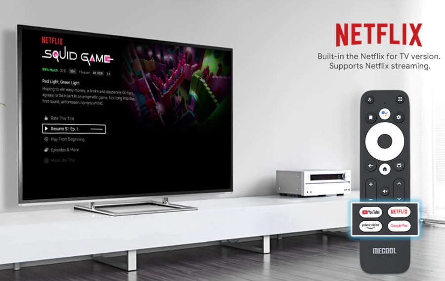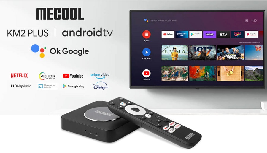 * Đầu tiên, KM2 Plus sẽ thừa hường toàn bộ những tính năng tương tự như Mecool K2 như AndroidTV chính chủ, Chromecast, Netflix 4K cấp phép, Dolby Audio....