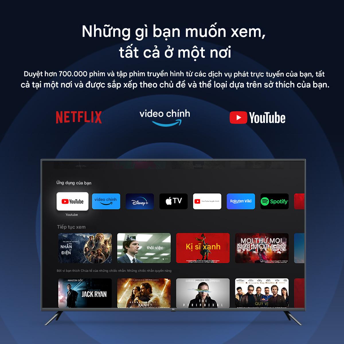 Ứng dụng: Netflix (hỗ trợ 4K), YouTube, Prime Video, Disney+, Google Play Store.