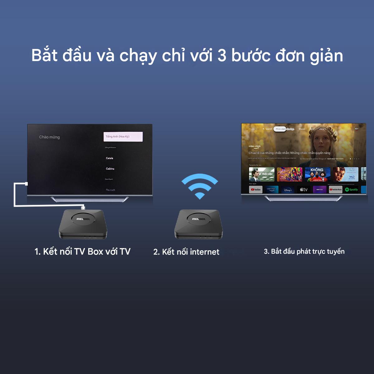 Kết nối: Cắm thiết bị vào TV qua cổng HDMI, kết nối nguồn điện và Wi-Fi/Ethernet.