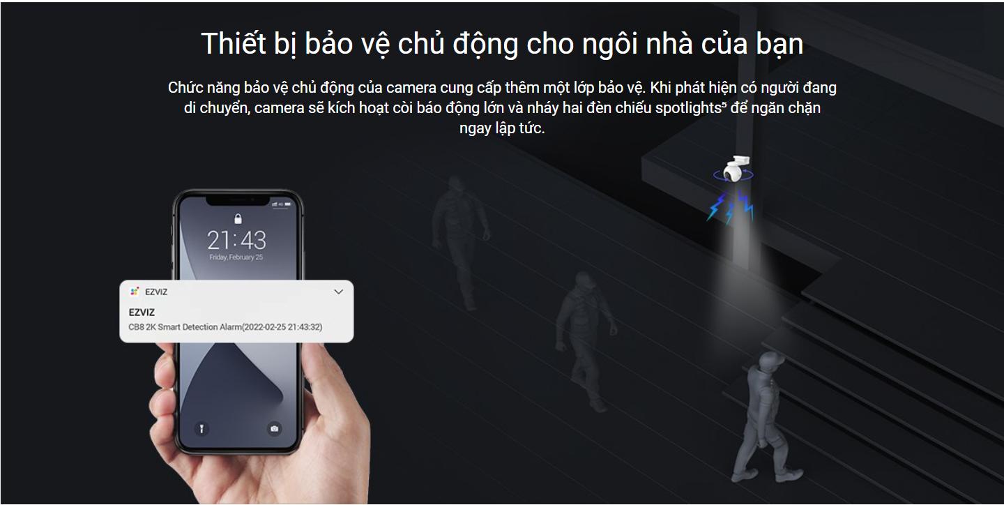 Chức năng bảo vệ chủ động của camera cung cấp thêm một lớp bảo vệ. Khi phát hiện có người đang di chuyển, camera sẽ kích hoạt còi báo động lớn và nháy hai đèn chiếu spotlights⁵ để ngăn chặn ngay lập tức.