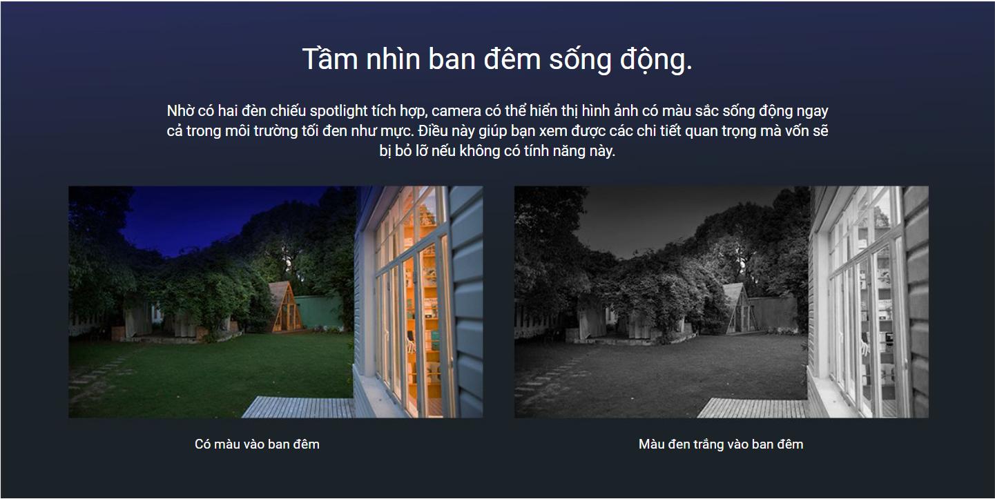 Nhờ có hai đèn chiếu spotlight tích hợp, camera có thể hiển thị hình ảnh có màu sắc sống động ngay cả trong môi trường tối đen như mực. Điều này giúp bạn xem được các chi tiết quan trọng mà vốn sẽ bị bỏ lỡ nếu không có tính năng này.