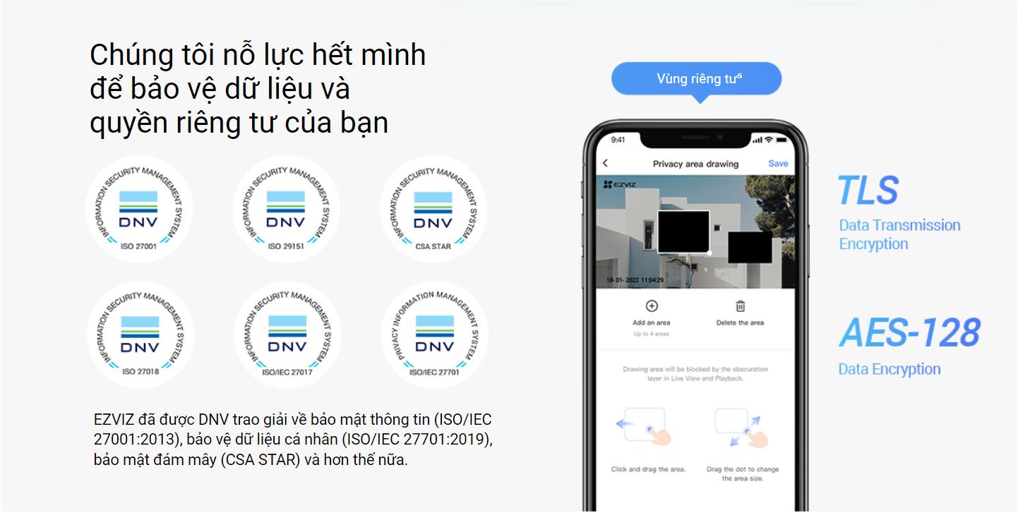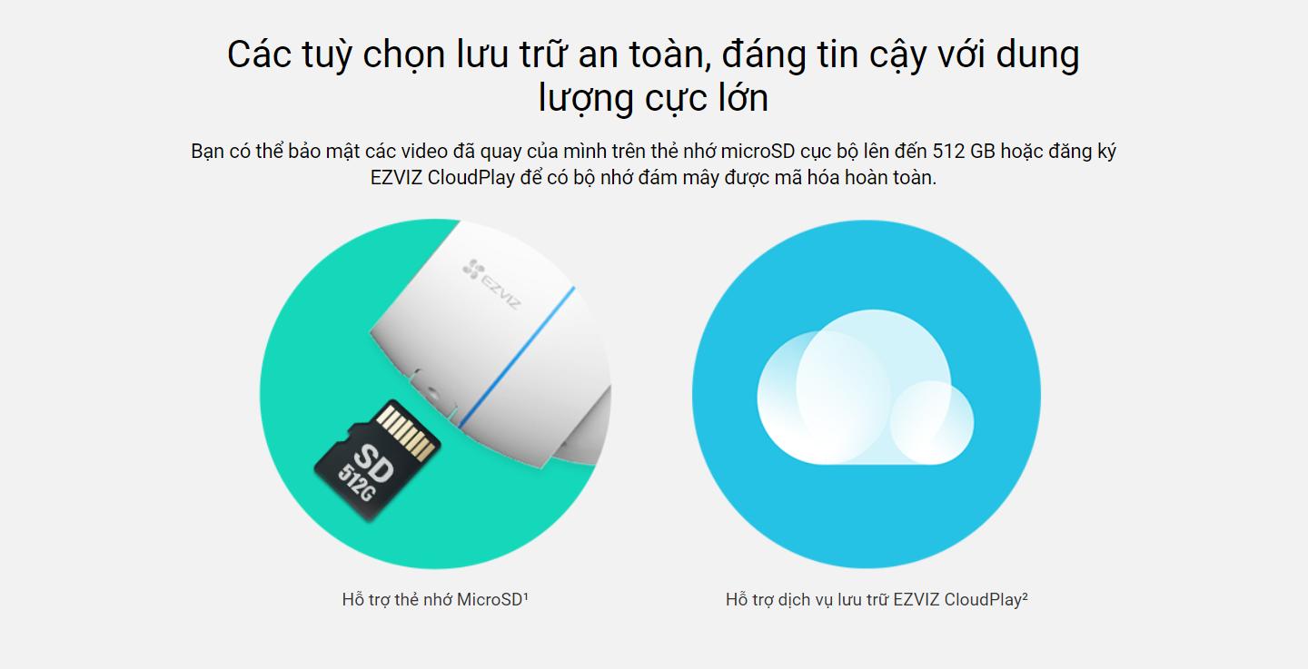 Bạn có thể bảo mật các video đã quay của mình trên thẻ nhớ microSD cục bộ lên đến 512 GB hoặc đăng ký EZVIZ CloudPlay để có bộ nhớ đám mây được mã hóa hoàn toàn.