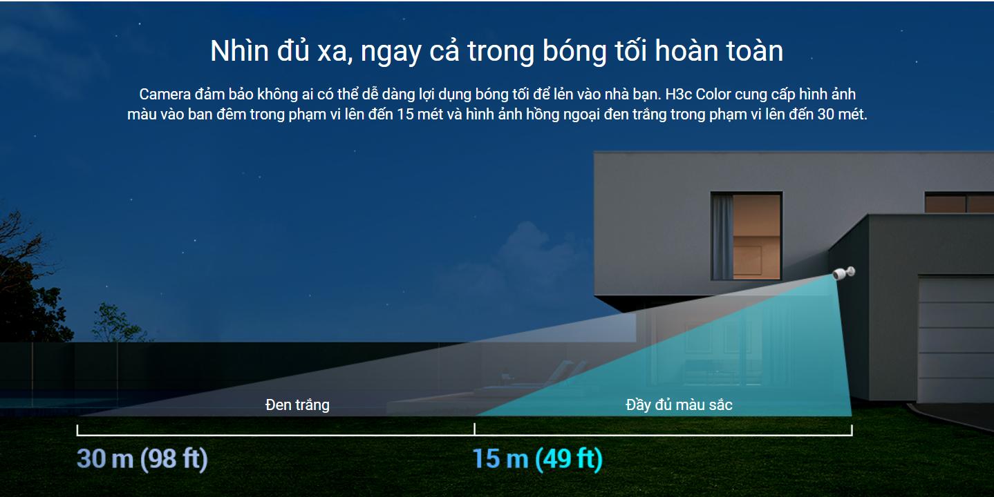 Camera đảm bảo không ai có thể dễ dàng lợi dụng bóng tối để lẻn vào nhà bạn. H3c Color cung cấp hình ảnh màu vào ban đêm trong phạm vi lên đến 15 mét và hình ảnh hồng ngoại đen trắng trong phạm vi lên đến 30 mét.
