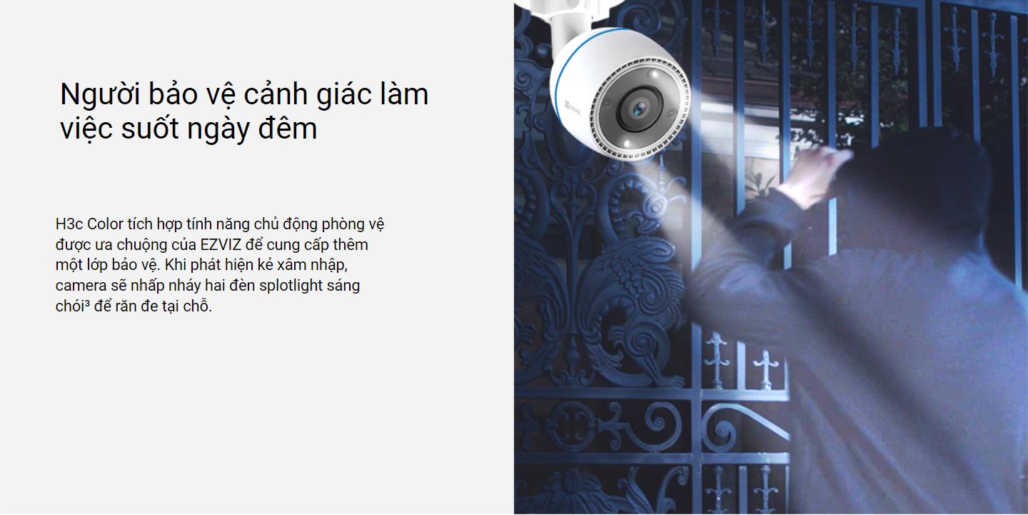 H3c Color tích hợp tính năng chủ động phòng vệ được ưa chuộng của EZVIZ để cung cấp thêm một lớp bảo vệ. Khi phát hiện kẻ xâm nhập, camera sẽ nhấp nháy hai đèn splotlight sáng chói³ để răn đe tại chỗ.