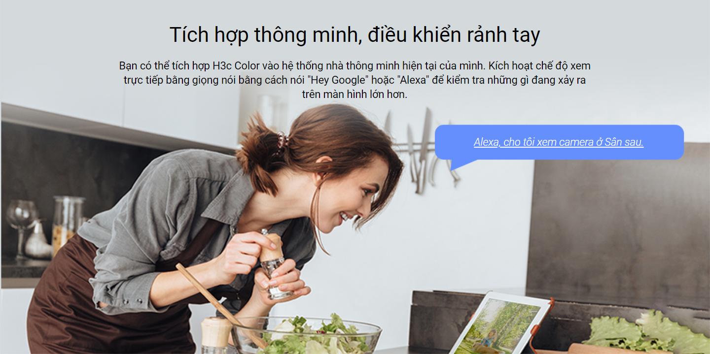 Bạn có thể tích hợp H3c Color vào hệ thống nhà thông minh hiện tại của mình. Kích hoạt chế độ xem trực tiếp bằng giọng nói bằng cách nói "Hey Google" hoặc "Alexa" để kiểm tra những gì đang xảy ra trên màn hình lớn hơn.
