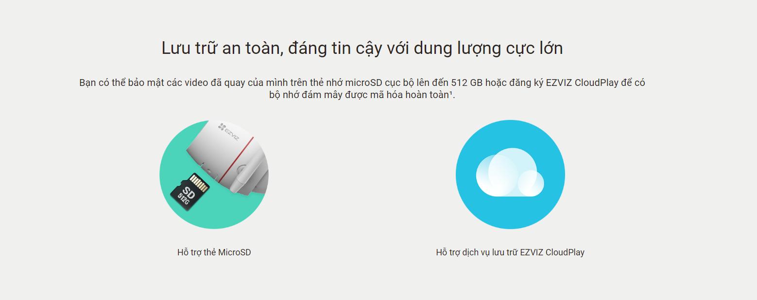 Trên thân camera được trang bị sẵn khe cắm thẻ nhớ, cho phép lưu lại lịch sử ghi hình trên thẻ Micro SD (tối đa 256GB), hoặc nếu muốn lưu trữ và an toàn hơn có thể lựa chọn Ezviz Cloud (có tính phí hàng tháng).