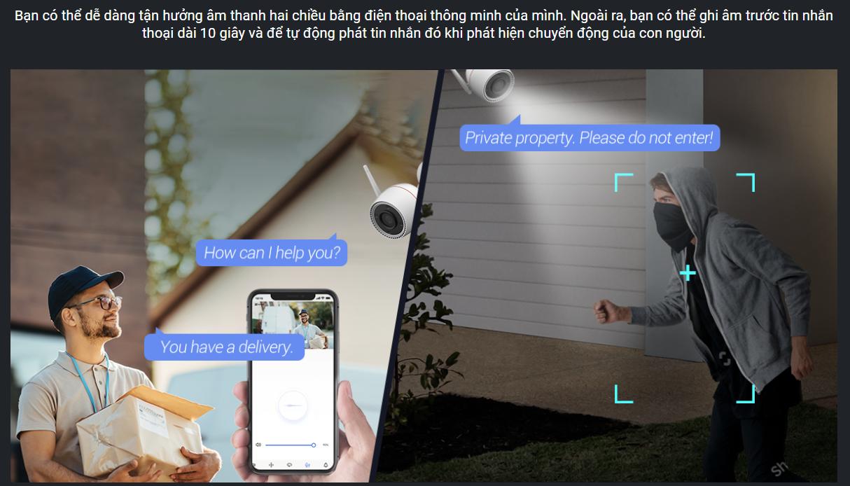 Bạn có thể dễ dàng tận hưởng âm thanh hai chiều bằng điện thoại thông minh của mình. Ngoài ra, bạn có thể ghi âm trước tin nhắn thoại dài 10 giây và để tự động phát tin nhắn đó khi phát hiện chuyển động của con người.