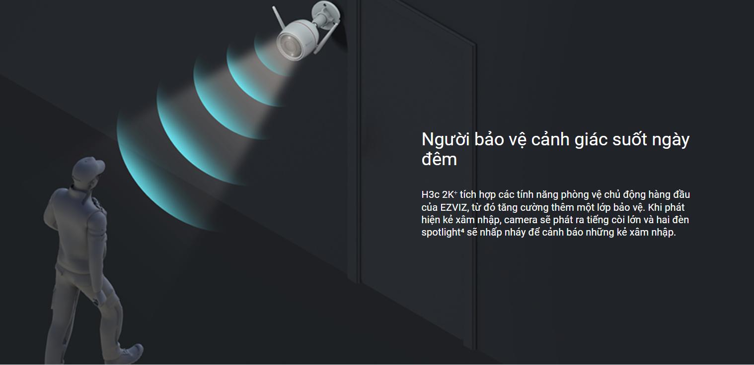 H3c 2K⁺ tích hợp các tính năng phòng vệ chủ động hàng đầu của EZVIZ, từ đó tăng cường thêm một lớp bảo vệ. Khi phát hiện kẻ xâm nhập, camera sẽ phát ra tiếng còi lớn và hai đèn spotlight⁴ sẽ nhấp nháy để cảnh báo những kẻ xâm nhập.