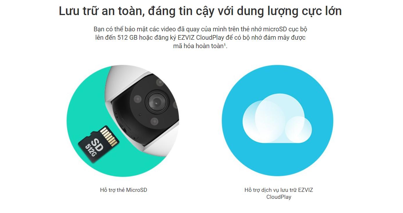 Bạn có thể bảo mật các video đã quay của mình trên thẻ nhớ microSD cục bộ lên đến 512 GB hoặc đăng ký EZVIZ CloudPlay để có bộ nhớ đám mây được mã hóa hoàn toàn.