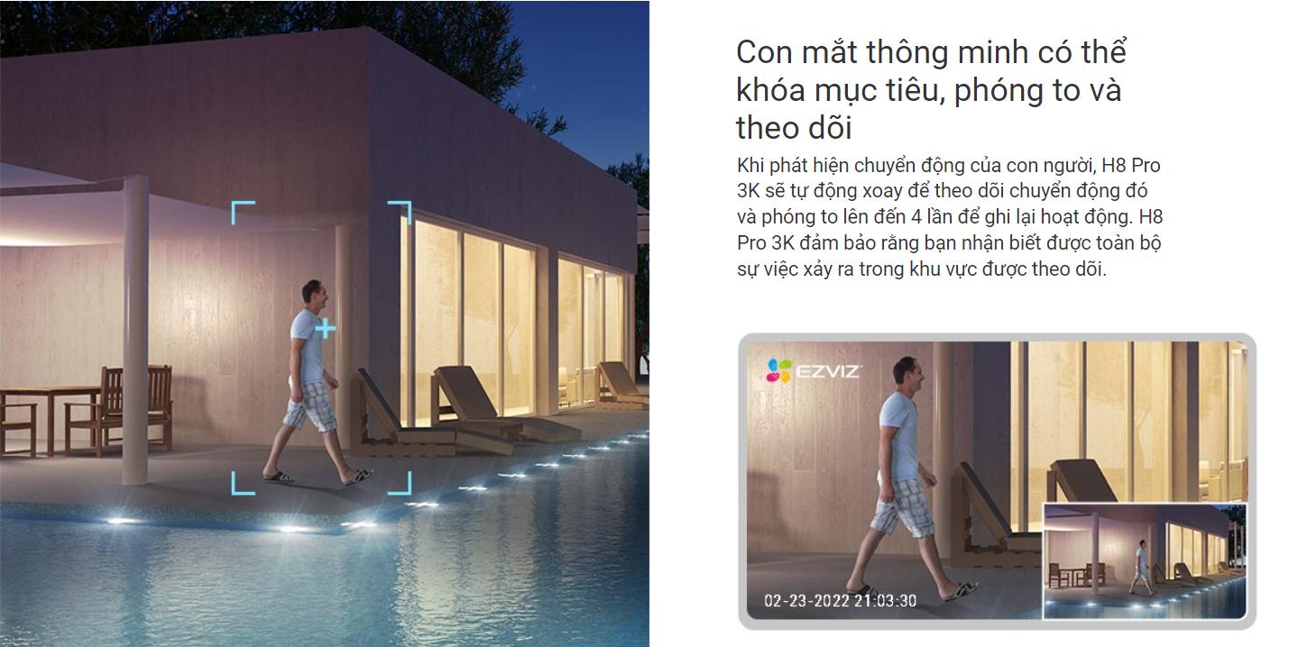 Khi phát hiện chuyển động của con người, H8 Pro 3K sẽ tự động xoay để theo dõi chuyển động đó và phóng to lên đến 4 lần để ghi lại hoạt động. H8 Pro 3K đảm bảo rằng bạn nhận biết được toàn bộ sự việc xảy ra trong khu vực được theo dõi.