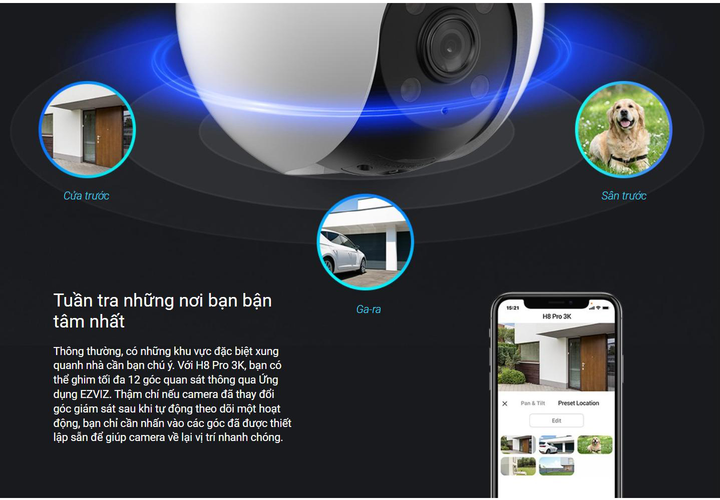 Thông thường, có những khu vực đặc biệt xung quanh nhà cần bạn chú ý. Với H8 Pro 3K, bạn có thể ghim tối đa 12 góc quan sát thông qua Ứng dụng EZVIZ. Thậm chí nếu camera đã thay đổi góc giám sát sau khi tự động theo dõi một hoạt động, bạn chỉ cần nhấn vào các góc đã được thiết lập sẵn để giúp camera về lại vị trí nhanh chóng.