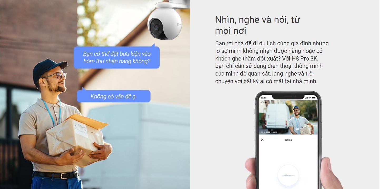 Bạn rời nhà để đi du lịch cùng gia đình nhưng lo sợ mình không nhận được hàng hoặc có khách ghé thăm đột xuất? Với H8 Pro 3K, bạn chỉ cần sử dụng điện thoại thông minh của mình để quan sát, lắng nghe và trò chuyện với bất kỳ ai có mặt tại nhà mình.