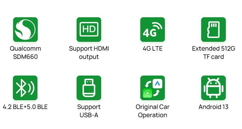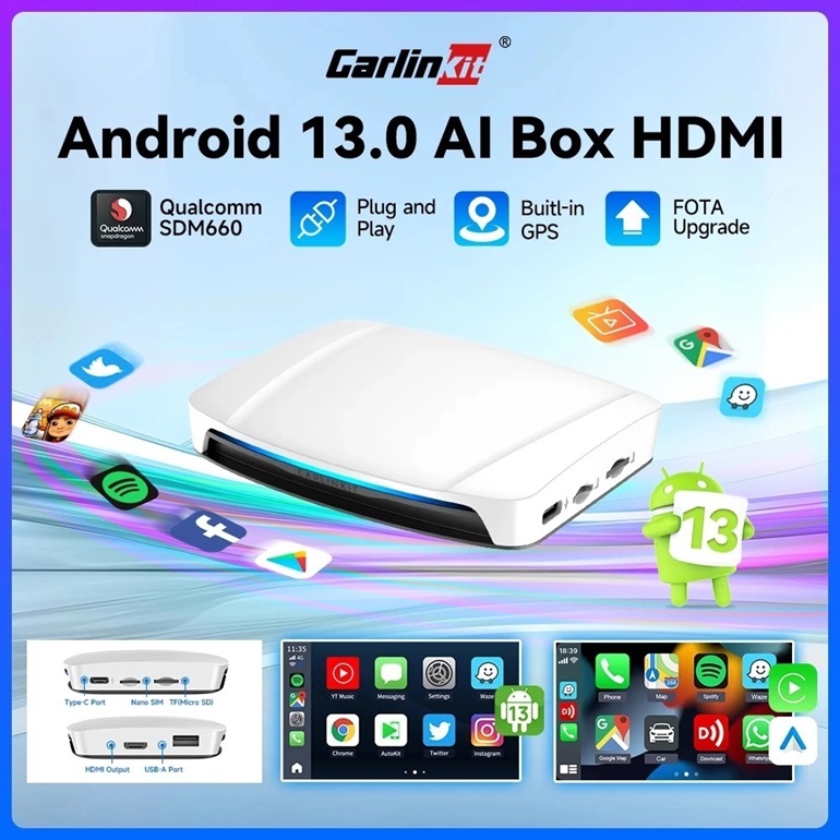 Android Box ô tô Carlinkit Tbox UHD SDM660 là phiên bản Android box ô tô thế hệ mới với một số cổng giao tiếp được được trang bị thêm như USB A và HDMI. Ngoài ra phần cấu hình cũng được trang bị CPU Snapdragon SDM660, Ram 8GB và bộ nhớ trong lên tới 128GB, hệ điều hành Android 13, đảm bảo đáp ứng tốt các nhu cầu sử dụng giải trí trên xe hơi của bạn.