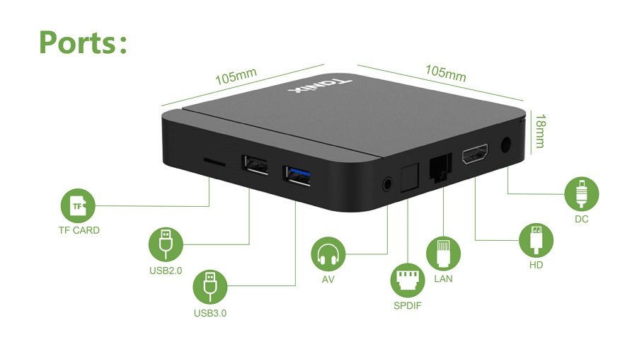 Tanix W2 được trang bị đầy đủ các cổng giao tiếp cơ bản cho người sử dụng Android TV Box như USB, Khe cắm thẻ nhớ, cổng âm thanh số Optial….