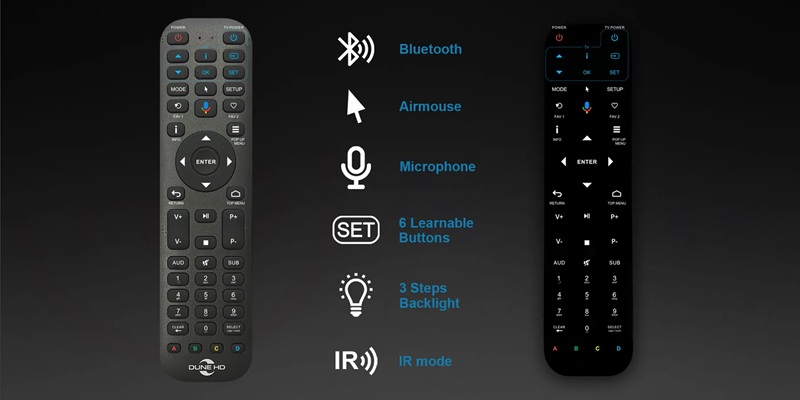- Điều Khiển Từ Xa Bluetooth Có Microphone, Chức Năng Học IR, Air Mouse, Đèn Nền, Chế Độ IR: Điều khiển từ xa Bluetooth đi kèm điều khiển media player qua kênh sóng vô tuyến, bao gồm microphone (cho tìm kiếm bằng giọng nói trong các ứng dụng hỗ trợ) và chức năng học IR (cho phép bạn cấu hình điều khiển từ xa để điều khiển không chỉ media player mà còn cả TV hoặc thiết bị khác). Chức năng Air Mouse cho phép điều khiển thuận tiện các ứng dụng Android không được tối ưu cho việc điều khiển bằng điều khiển thông thường. Điều khiển có đèn nền có thể cấu hình (có thể đặt ở 3 mức độ sáng hoặc tắt). Điều khiển hỗ trợ cả chế độ Bluetooth và IR (có thể chuyển đổi thủ công sang chế độ IR nếu cần).