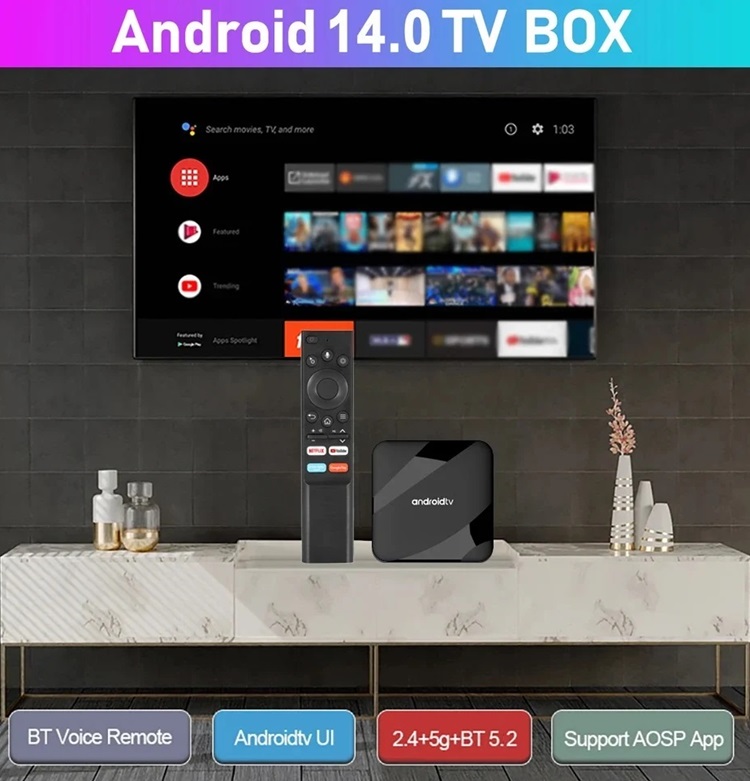 Giao diện hiện đại: TV Box TV98 ATV W2 sử dụng hệ điều hành Android 14 mới nhất, mang đến giao diện người dùng trực quan, dễ dàng sử dụng và tối ưu hóa cho TV.