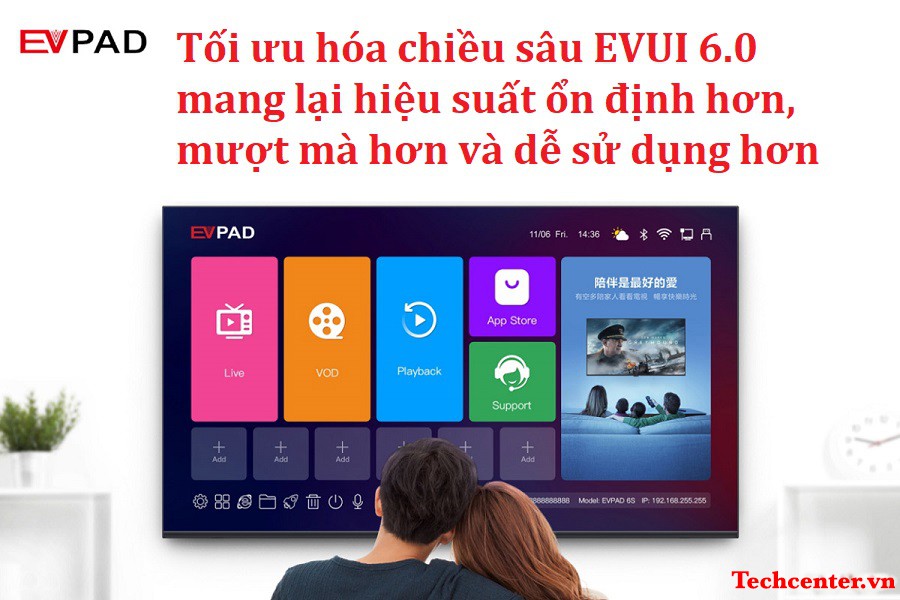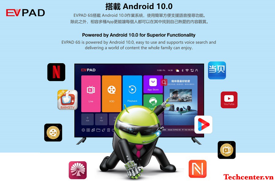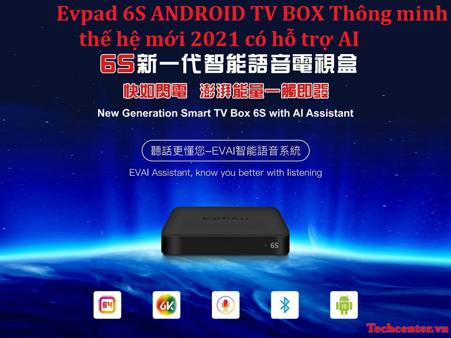 - EVPAD 6S được hỗ trợ trên nền tảng Android 10.0, dễ sử dụng và hỗ trợ tìm kiếm bằng giọng nói và cung cấp một thế giới nội dung mà cả gia đình có thể thưởng thức.