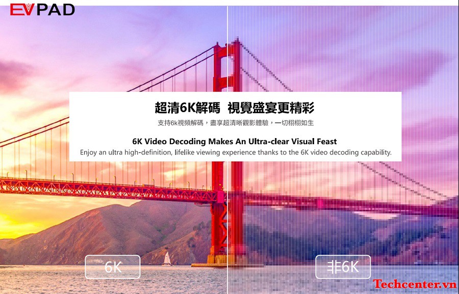 - Với EVPAD 6S hộp truyền hình thông minh, bạn chỉ cần tận hưởng trải nghiệm xem siêu nét, sống động như thật nhờ khả năng giải mã video 6K.