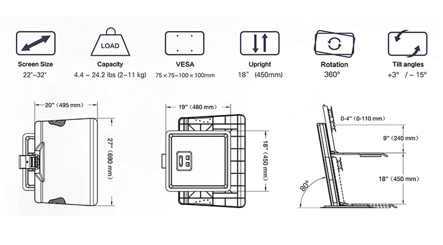 Phù hợp với màn hình từ 22” đến 32” với trọng lượng tối đa là 12kg.