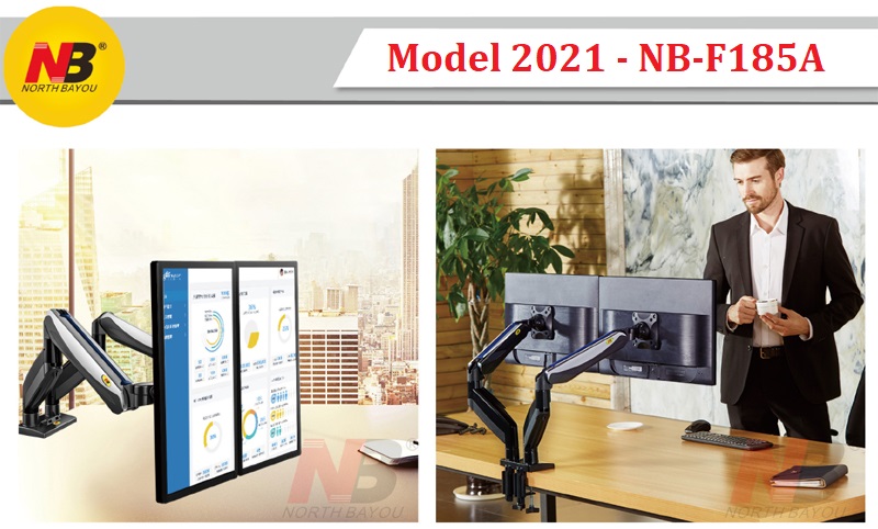 - Tay đỡ màn hình NB F185A là giá treo gắn hai màn hình máy tính gắn bàn dành cho màn hình từ 22 đến 27 inch với tải trọng lên đến 16kg.