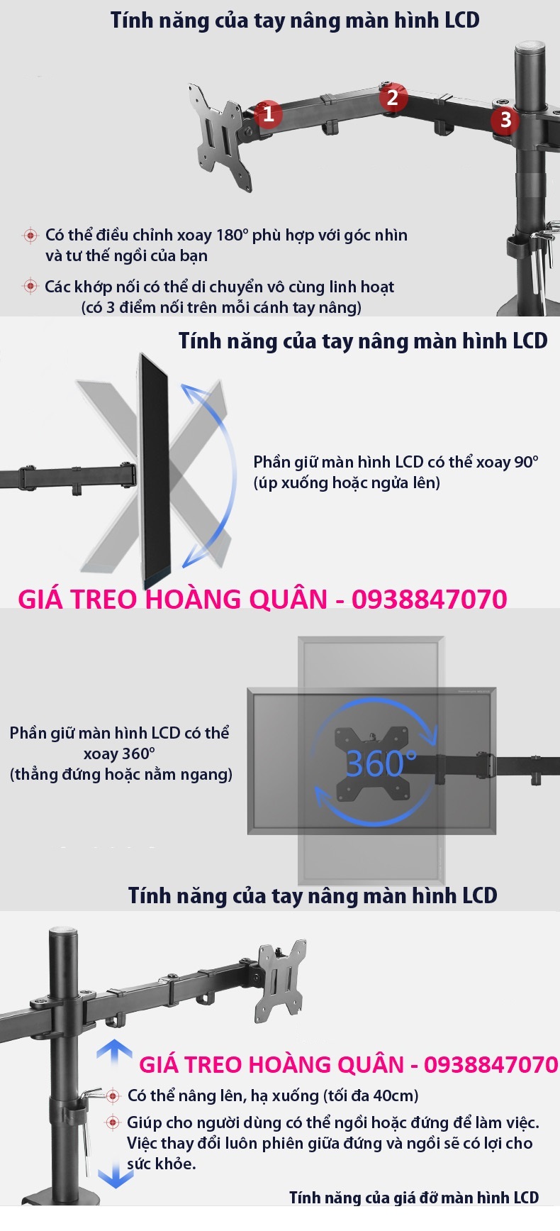 - Các khớp xoay của giá đỡ có thể xoay lên xuống, xoay sang trái phải 180 độ, xoay màn hình 360 độ. Bạn có thể dễ dàng chỉnh góc của màn hình sao cho có được góc quan sát tốt nhất với cả 4 màn hình.