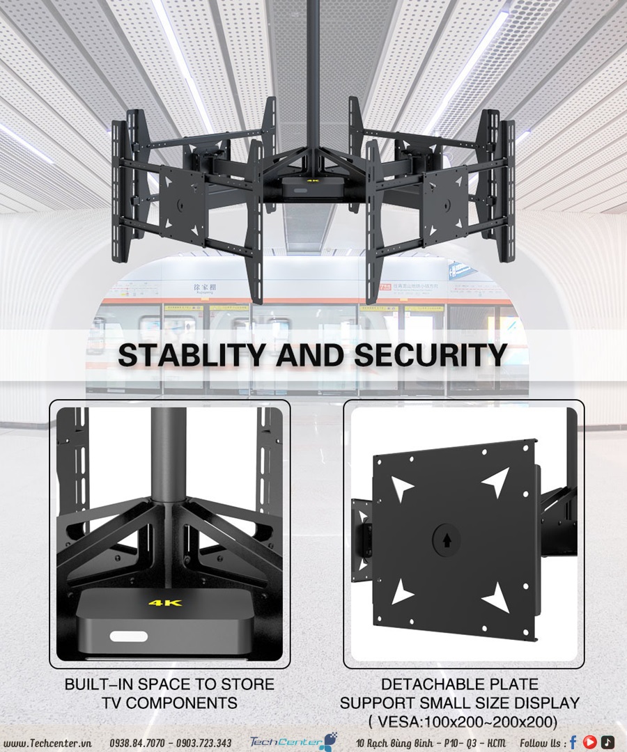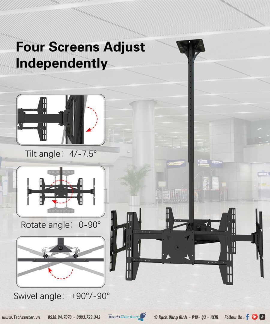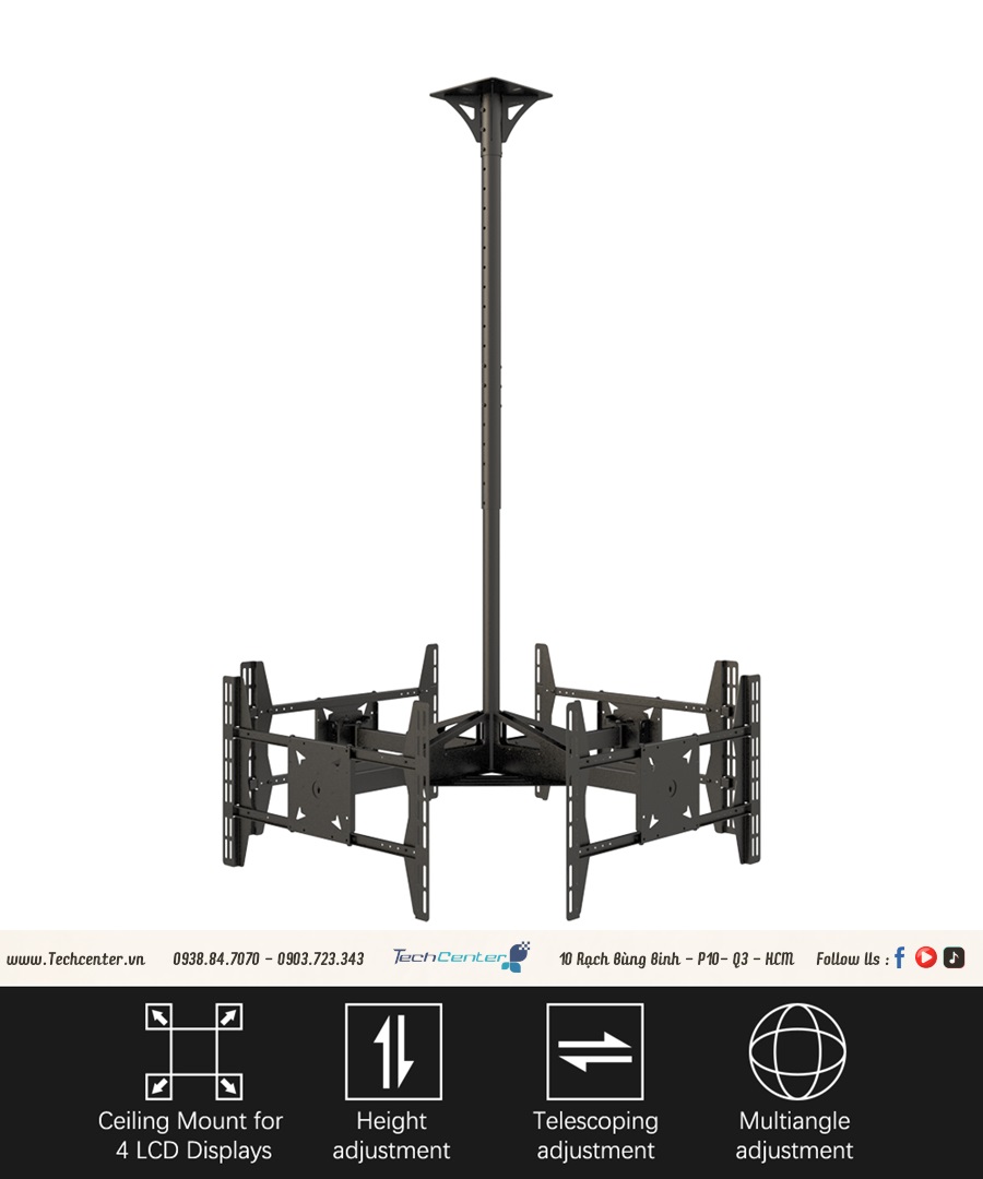 Giá treo tivi thả trần 4 màn hình hq-4m là dạng giá treo tivi ngược lên trần và có thể điều chỉnh tivi được nhiều hướng. Tải trọng là 35kg cho mỗi màn hình (32-65 inch) với vesa tối đa 600*400mm và phạm vi xoay là +45 °/-45 °. Phạm vi nghiêng 4° lên trên và 7,5° xuống dưới.