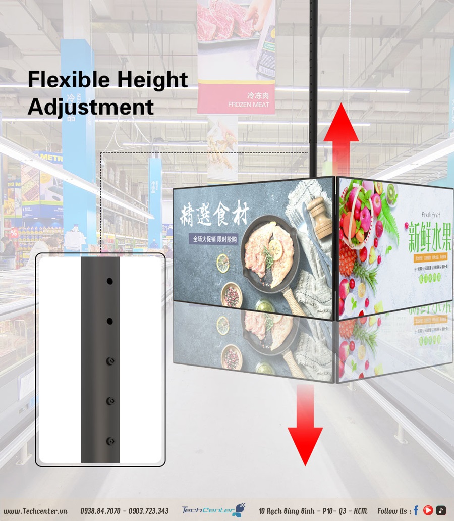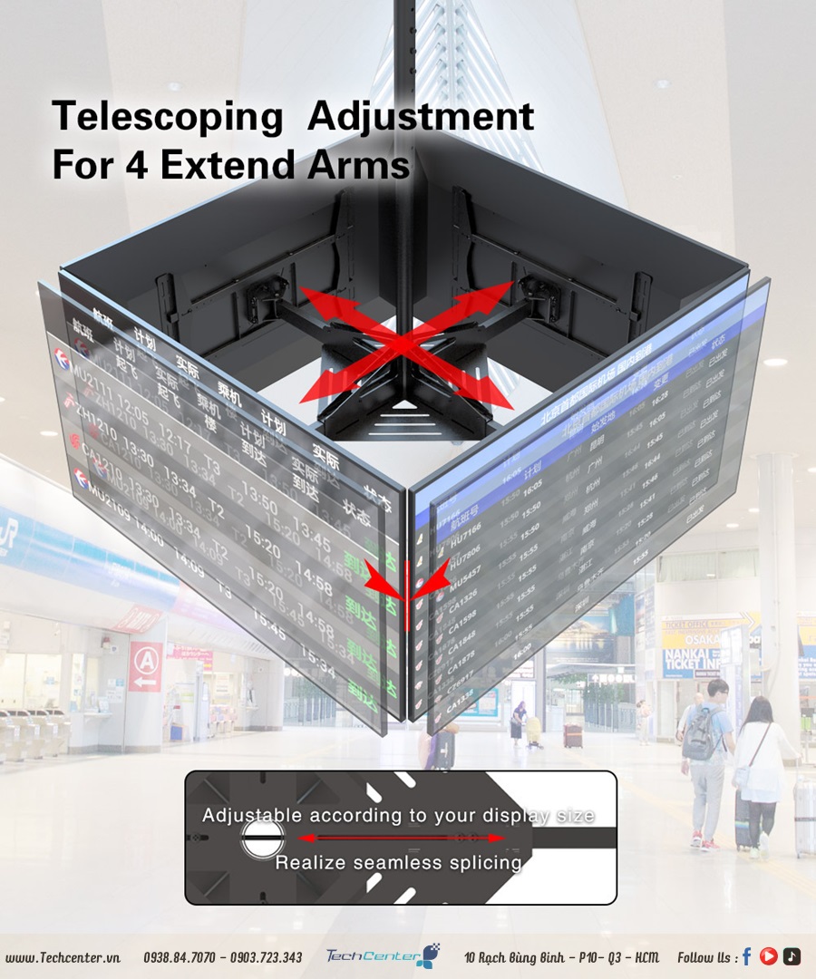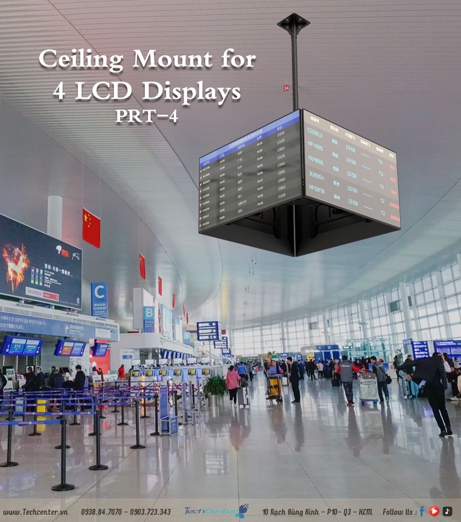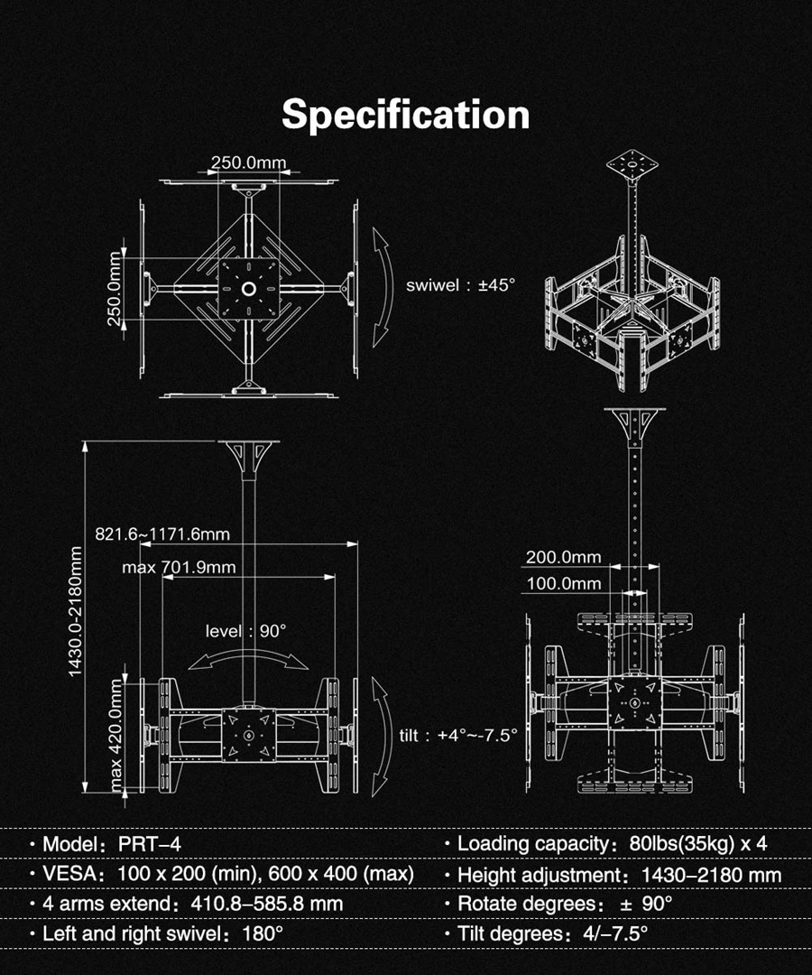 Giá treo tivi thả trần 4 màn hình hq-4m là dạng giá treo tivi ngược lên trần và có thể điều chỉnh tivi được nhiều hướng. Tải trọng là 35kg cho mỗi màn hình (32-65 inch) với vesa tối đa 600*400mm và phạm vi xoay là +45 °/-45 °. Phạm vi nghiêng 4° lên trên và 7,5° xuống dưới.