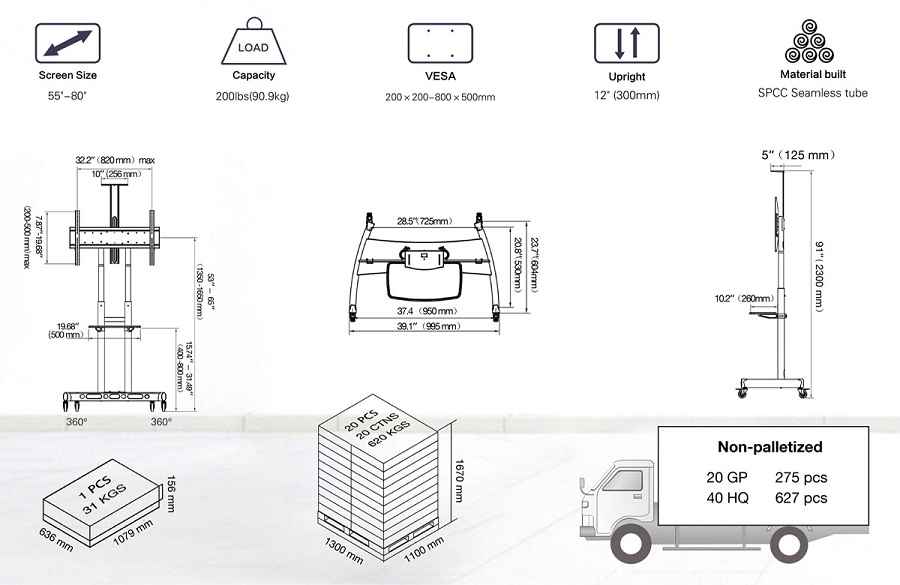 - Giá treo tivi di động NB AVA1800 được thiết kế có trọng lượng lên tới 200 lbs (90.9kg) hoặc màn hình phẳng 80" với 4 bánh xe, do đó cung cấp cho bạn một cách dễ dàng sự di chuyển đến bất kỳ hướng và vị trí nào bạn mong muốn.