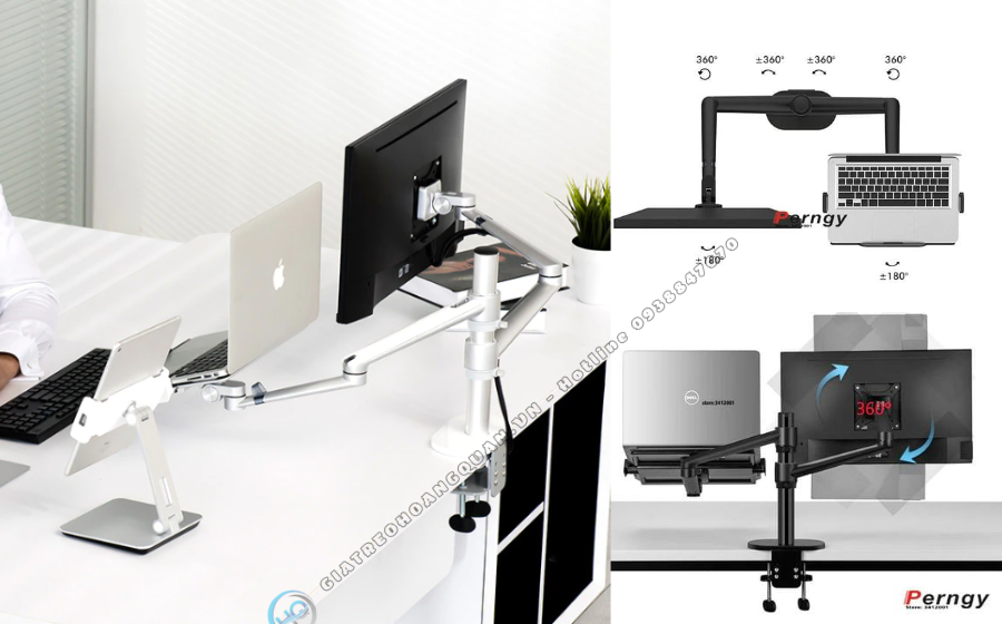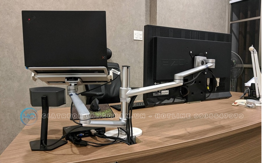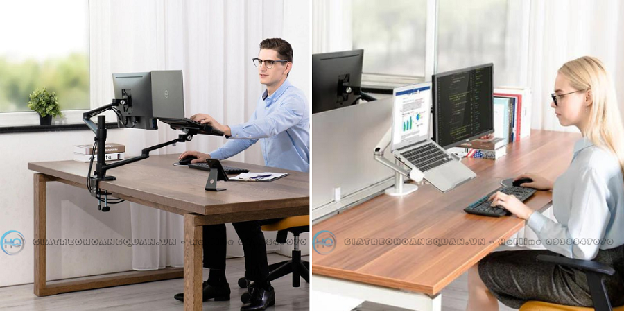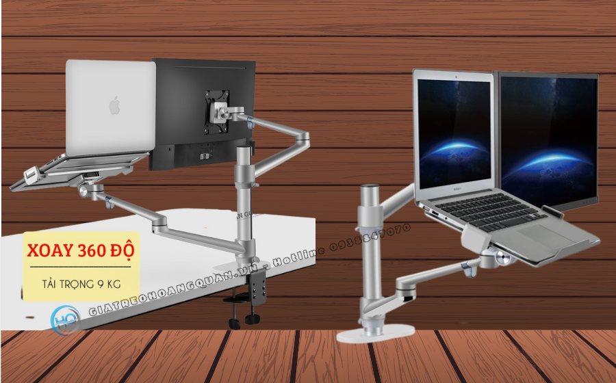 * Để tìm kiếm 1 giá treo màn hình có nhu cầu sử dụng cùng lúc 1 màn hình máy tính và 1 laptop thì giá treo HQ 3L là dòng sản phẩm kẹp bàn và kèm giá đỡ mọi dòng laptop hiện nay trên thị trường.
