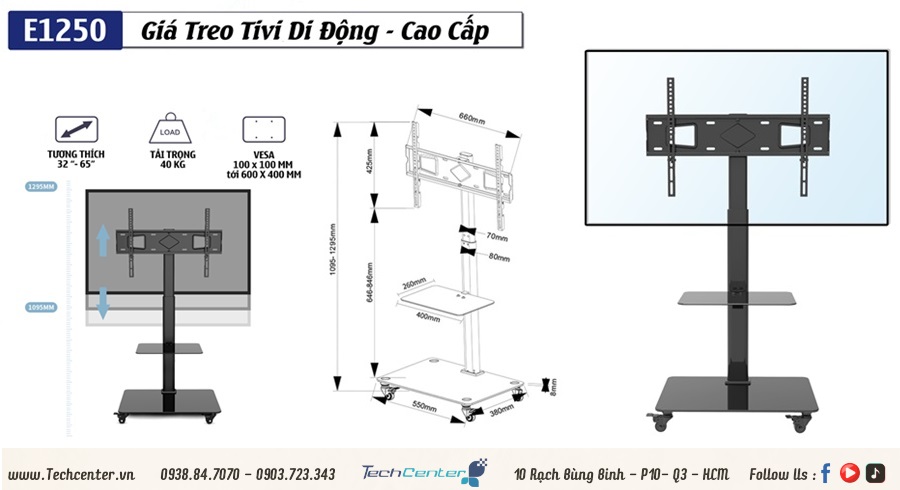 Ngoài những sản phẩm giá treo tivi di động hiện tại Techcenter còn đang phân phối rất nhiều mẫu giá treo tivi xoay đa năng, giá treo treo tivi cố định sát tường, giá treo màn hình máy tính