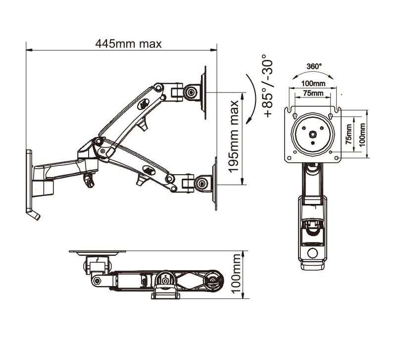 - Xoay nghiêng -50° đến +30° (Khung treo có 2 khớp nối).