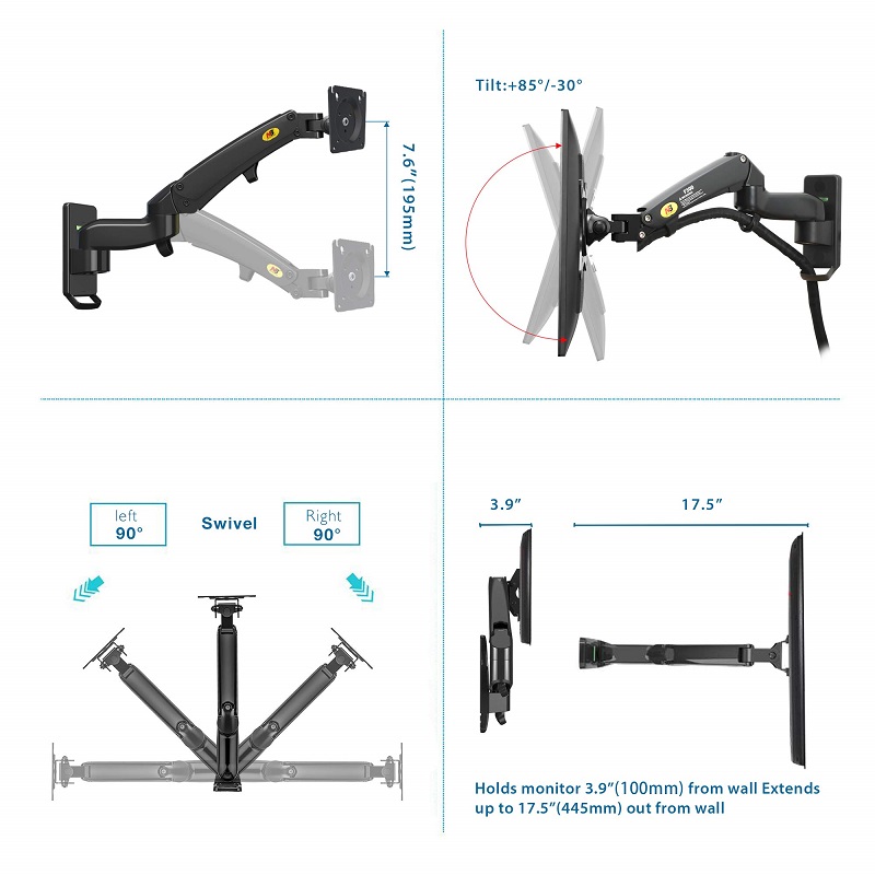 Đầu tiếp xúc với màn hình có thể điều chỉnh màn hình xoay ngang, xoay dọc tùy theo ý muốn với phạm vi điều chỉnh lên xuống như sau.