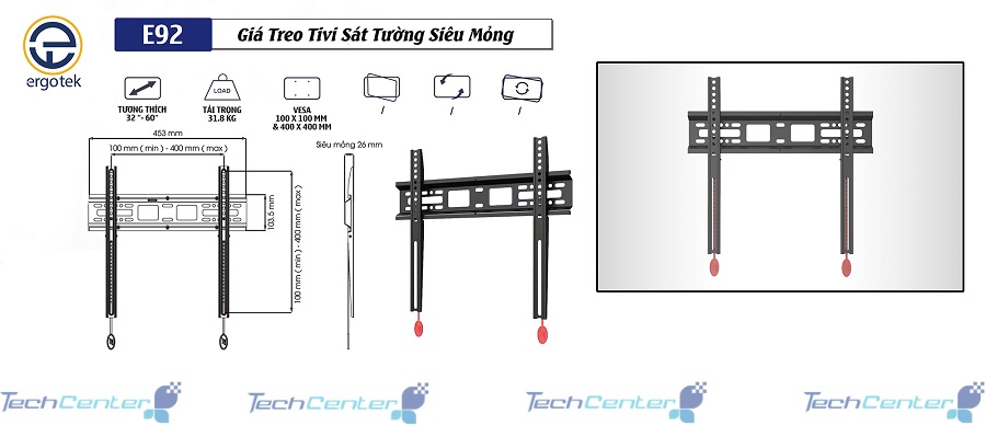 - Giá treo tivi thẳng cố định E92 được thiết kế rất đơn giản phổ biến, mọi người có thể lắp đặt 1 cách nhanh chóng.