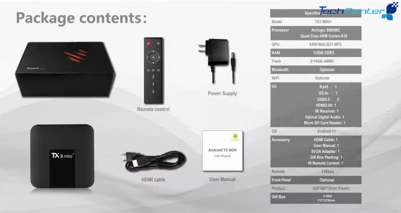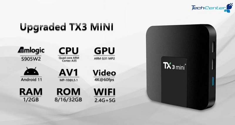 Ở mã sản phẩm này, TechCenter giới thiệu đến dòng cao cấp nhất là TX3 mini+ Plus là phiên bản Dual Wifi và Ram 4GB, Rom 32G, Android 11, Bluetooth.